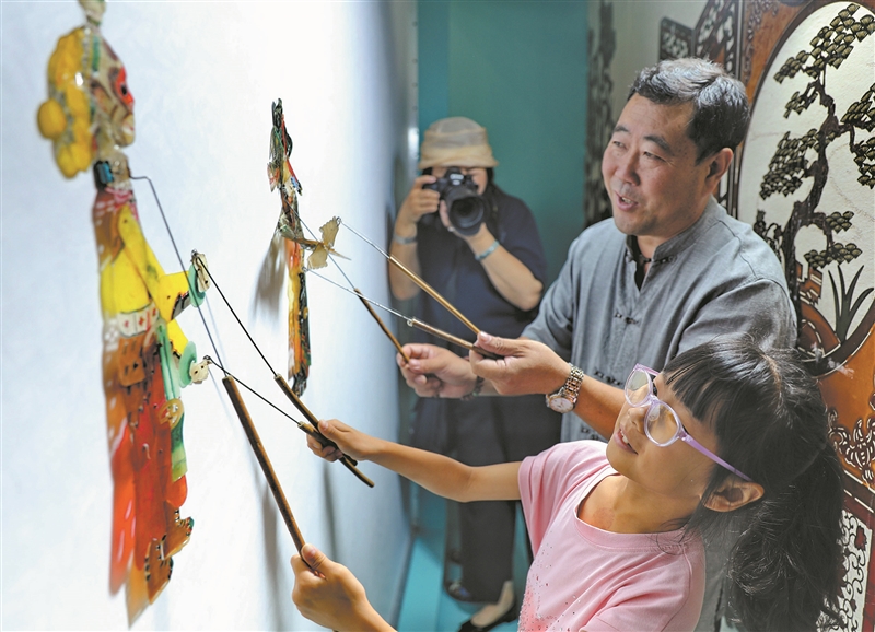 | 7月12日,杨明忠在展览现场带领小朋友体验皮影艺术。 |