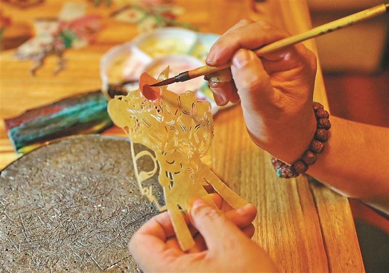 | 7月29日,杨明忠为雕刻的驴皮影着色。 本版图片由曹建雄摄 |