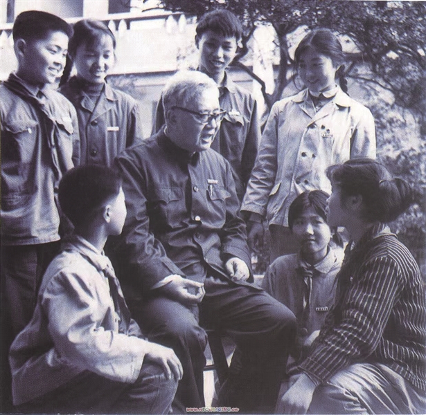 | 图②: 1980年华罗庚与金坛县中学三好学生代表交谈。 |