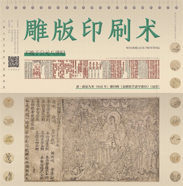 1907年,在甘肃敦煌石窟中发现的唐咸通九年(868年)雕版印刷的《金刚般若波罗蜜经》,带有佛像插图,十分精美。该经现藏于伦敦大英博物馆,举世闻名,由于上面有明确的年代记载,长期以来被认为是中国发明印刷术的物证。