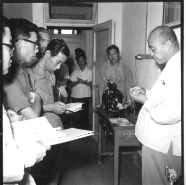 | 1964年,何作霖(右一)向参加北京科学讨论会的嘉宾介绍稀土研究成果。(国连杰供图) |