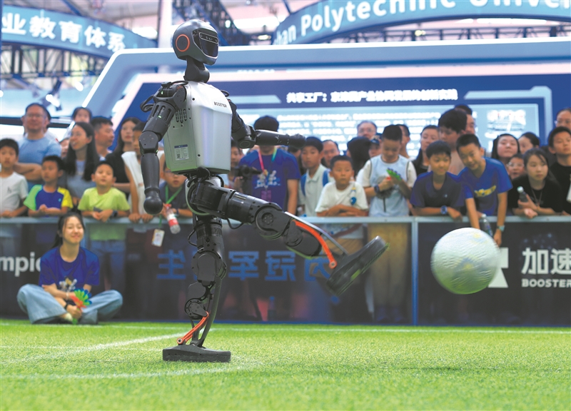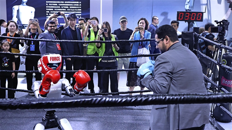 拳风呼啸处,人形机器人正上演巅峰对决!宇树科技展区内,格斗机器人施展侧踢、勾拳,被击倒后又瞬间弹起反击。这场毫秒级响应的战斗背后,体现了新一代国产机器人动态平衡算法的飞跃。在加速进化展区,一场接一场的足球表演赛与人机足球对垒,让观众过足了眼瘾。