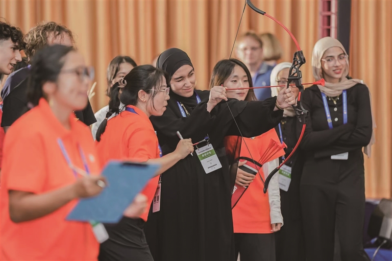 | “国际青年文化交流会”现场,埃及选手正在体验内蒙古传统的射箭运动。 |