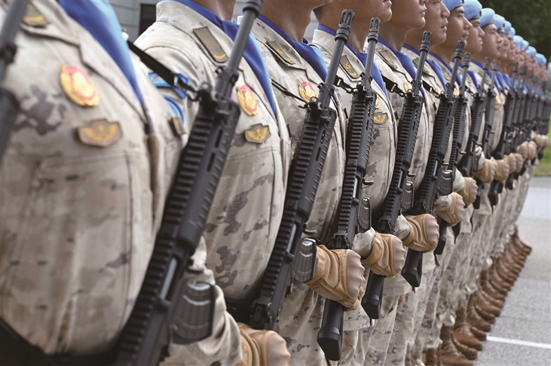 | 8月20日,北京,参加联合国维和任务的中国士兵正在进行阅兵演习。 视觉中国供图 |