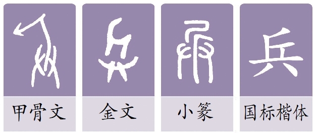 再来分析一下“兵”字。它的上面是“斤”,“斤”的甲骨文就像一把斧子,是砍伐树木的工具。如果给“斤”加上“父”,就会变成“斧”字。有个成语是“运斤成风”,说的是楚国一个工匠能够挥动斧子,带起呼呼的风,一下子把朋友鼻尖上沾着的一层薄薄的白粉削掉,而丝毫不会损伤朋友的鼻子。后来人们就用“运斤成风”比喻手法熟练、技艺高超。
