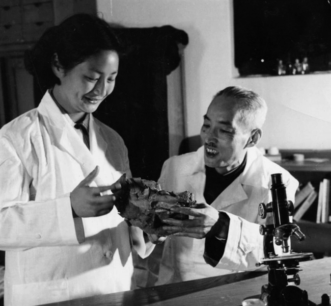 | 戴芳澜(右)与学生郑儒永在实验室。 (资料片) |