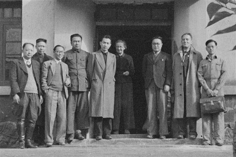 | 1944年,吴学周(左三)等在位于云南平彝县的低温碳化厂办公室门前。 |