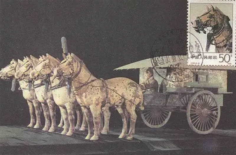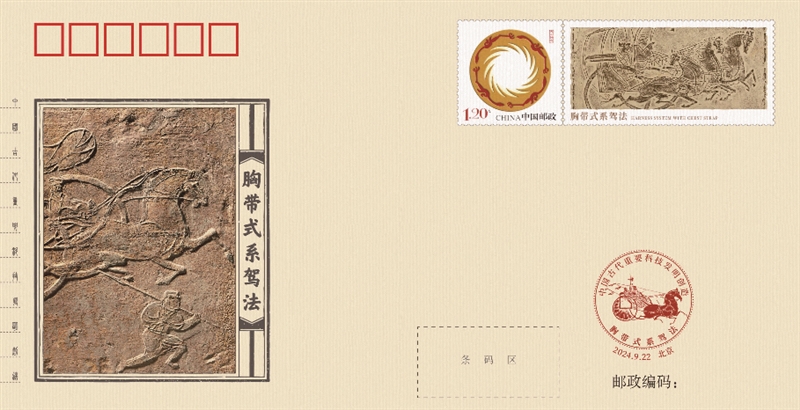 | 图①: 胸带式系驾法石刻拓片。(作者供图) 图②③: “胸带式系驾法”纪念封及内插页。(中国集邮有限公司供图) 图④: 秦始皇陵铜车马坑出土的胸带式系驾法马车实物及纪念邮票。(作者供图) 图⑤: “系驾”篆刻章。(马国馨院士 刻) |