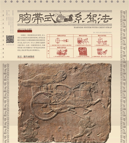 中国古代胸带式系驾法,是马车系驾技术的重要发明,通过一条绕过马胸的宽皮带作为牵引承力点,将支点和受力点分开,减轻局部受力并利用马腹肌力量,提升了马车运行效率。