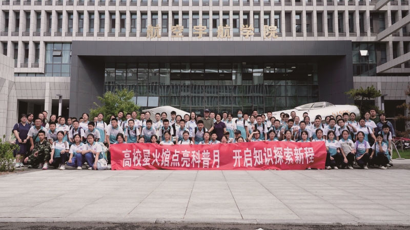 图⑥: 山西省高校星火馆科普月活动启动仪式上,山西省三十九中师生与原空军八一飞行表演队副队长张信民大校合影。中北大学供图