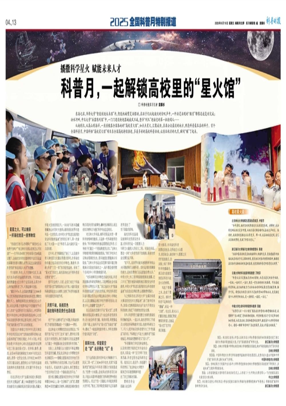 为落实去年新修订的《中华人民共和国科学技术普及法》对“支持高校将科普纳入社会服务职能”的相关规定,今年3月起,中国科协青少年科技中心牵头发起高校科普品牌示范工程(高校星火馆)。经申报、推荐、遴选,全国65所高校被确定为2025年首批试点高校,获得一定资金支持,另外有近300所作为项目建设高校,鼓励向公众开放科技基础设施和科技展教资源,切实履行科普社会责任。