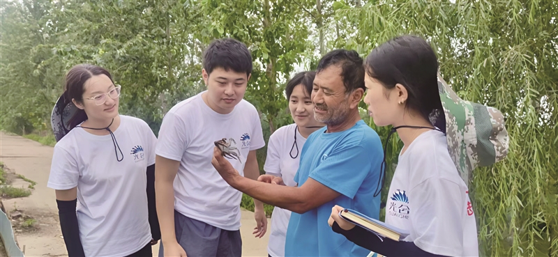 | 辽宁大洼河蟹科技小院的学生们在与螃蟹养殖户交流。 中国农村专业技术协会供图 |