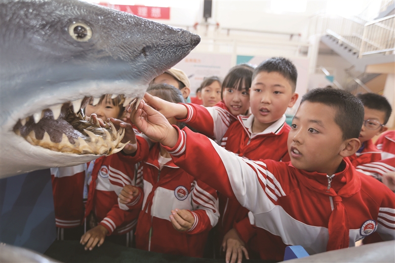 | 甘肃省定西市安定区关川实验学校的学生在观看海洋生物标本。 新华社发 |