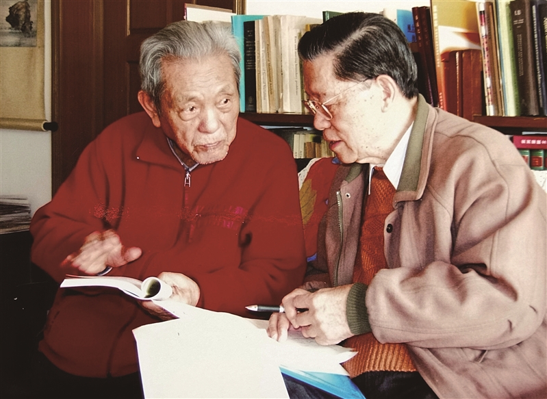 2005年春天的一个下午,在北京市中关村黄庄,彭桓武(左)与陈能宽(右)两人肩并肩坐在一起,聊起彭桓武与陈省身院士曾经一唱一和的双文诗(原诗用英文和中文各写一遍)手稿。
