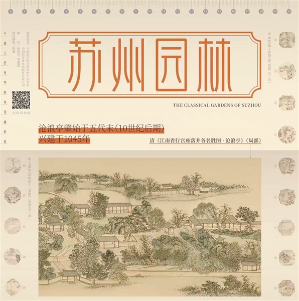苏州园林起始于春秋晚期,发展于唐宋,至明、清两代最为鼎盛。沧浪亭、狮子林、拙政园、留园、网师园等均享有盛名。沧浪亭始建于公元910年前后,已有千年以上的悠久历史。