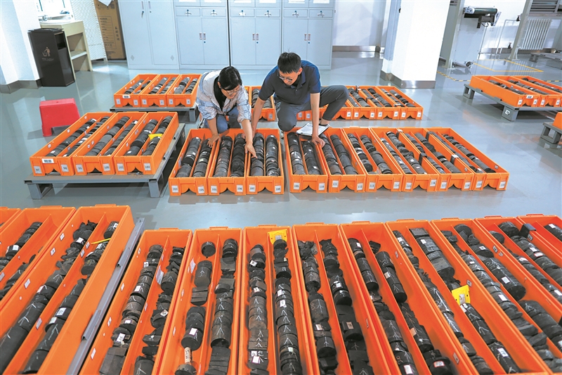 | 8月7日, 科研人员在大庆油田岩芯库观察页岩油岩芯。截至2025年7月31日,这里已累计保存5882口井的岩芯,库存岩芯总长456969.25米。 |