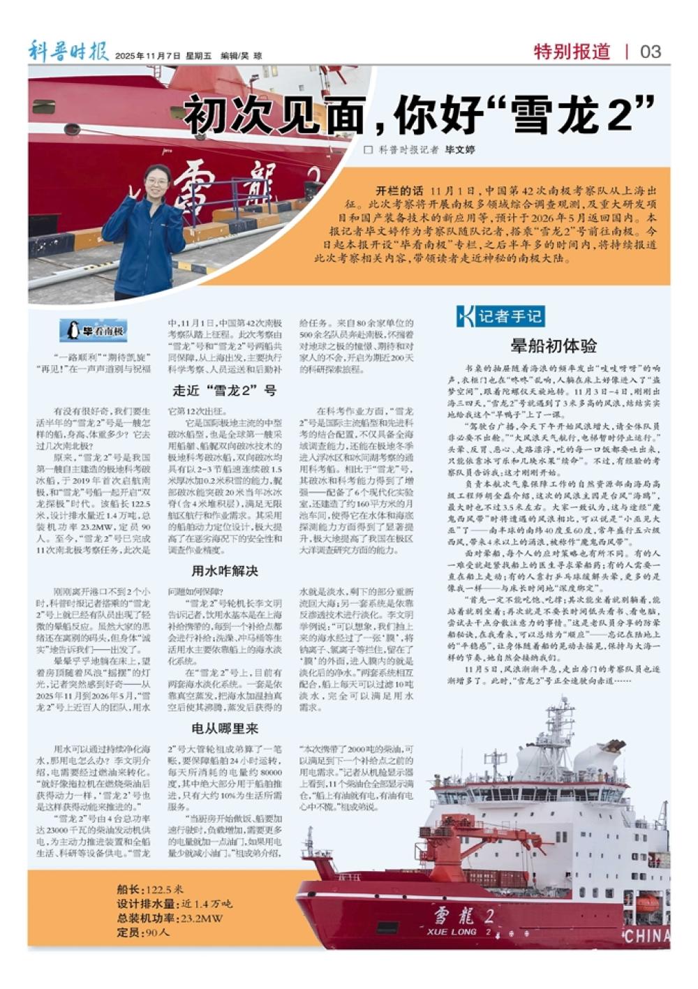 开栏的话 11月1日,中国第42次南极考察队从上海出征。此次考察将开展南极多领域综合调查观测,及重大研发项目和国产装备技术的新应用等,预计于2026年5月返回国内。本报记者毕文婷作为考察队随队记者,搭乘“雪龙2”号前往南极。今日起本报开设“毕看南极”专栏,之后半年多的时间内,将持续报道此次考察相关内容,带领读者走近神秘的南极大陆。