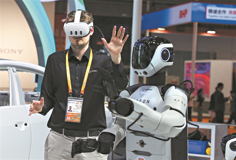 11月5日,第八届中国国际进口博览会在国家会展中心(上海)开幕。本届进博会有155个国家、地区和国际组织参与,4108家境外企业参展,展览面积超过43万平方米,展览面积和企业总数均创历史新高。图为工作人员在技术装备展区展示一款工业场景人形机器人。新华社记者 王婧嫱 摄