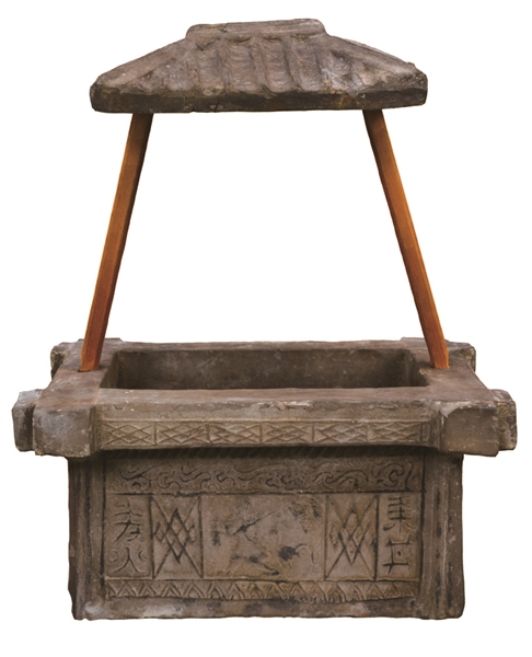 井上设有亭盖,盖下原本还有滑轮和取水的小罐。陶器后壁刻有一牛在槽中饮水的图案,并饰以火焰及鱼纹,这些都与水有关。