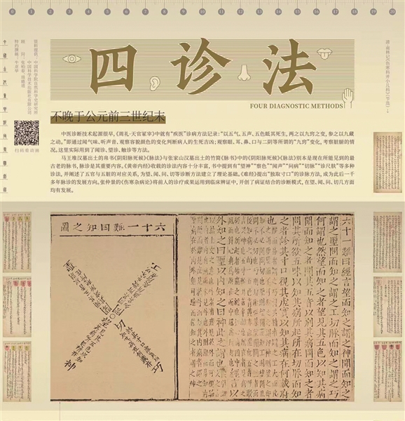有关四诊法出现的最早证据,则来源于马王堆出土的、抄写时代不晚于秦汉之际的一卷帛书。该帛书中已经有四诊法出现的直接与间接证据。例如,该文献明确记述了一种古老的脉诊方法,可以诊察到脉的盈虚、滑涩、静动等。因此,中医学意义上的四诊法的出现,应当不晚于公元前3世纪晚期。