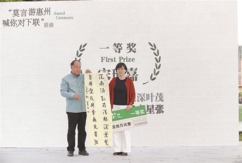 今年6月,诺贝尔文学奖得主莫言在广东惠州惠阳区秋长街道周田村,参观百年客家围屋——碧滟楼叶亚来主题文化展示馆时,有感而发,写下“从南阳到南洋根深叶茂”十字上联,并发出“向天下文友敬求下联”之邀。10月20日,征联获奖名单揭晓,来自广东的21岁年轻人宋珂嘉,以“自井壁及井毕角亢星张”的下联独揽一等奖,喜获10万元奖金。北京师范大学终身特聘教授、著名诗人欧阳江河对此表示,这是“多年难遇的绝对”。