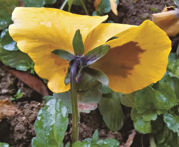 三色堇是堇菜科堇菜属二年或多年生草本植物。其生态策略独特,花朵结构也别具一格。4年前我在重庆拍下一朵带露珠的三色堇(图2),由花面中心可见八字形排列的两簇白毛(图3),此处正是蜜蜂采蜜的入口处。当蜜蜂把长喙插进去时,就会触及柱头上湿漉漉的唇瓣,喙上的花粉便被撸了下来。长喙继续深入,经过长有许多疣毛的区域,新的花粉又被粘上。