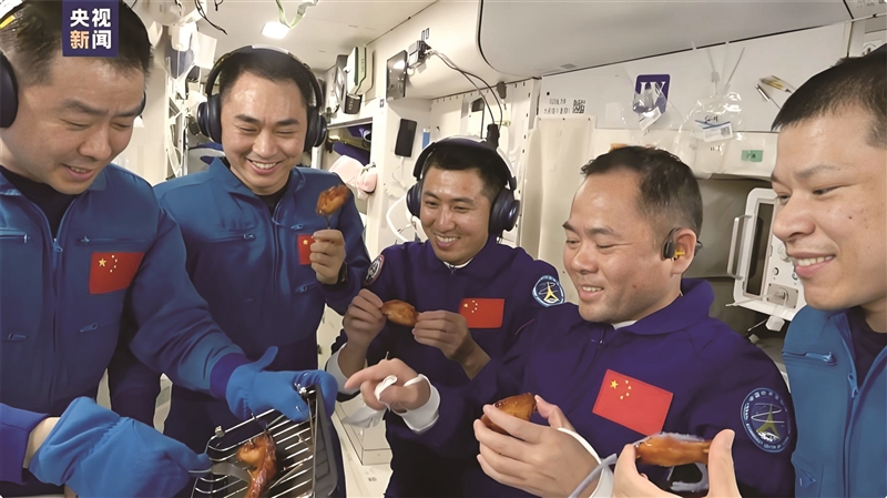 | 神舟二十号与神舟二十一号航天员乘组在中国空间站品尝烤鸡翅。视频截图 |