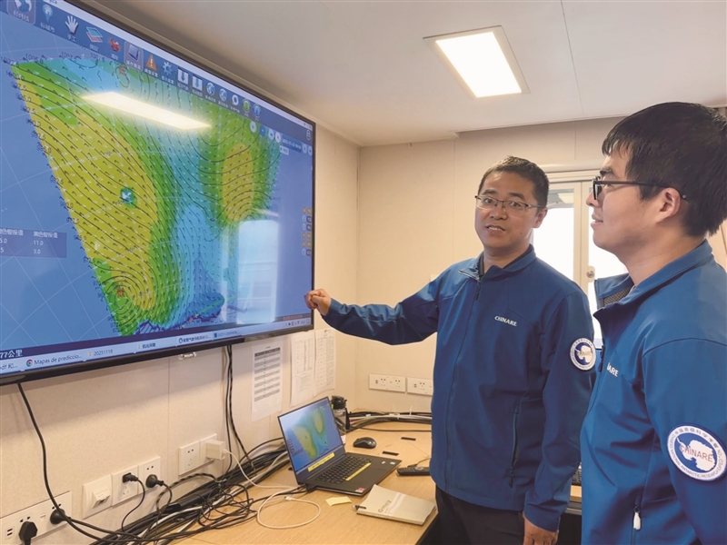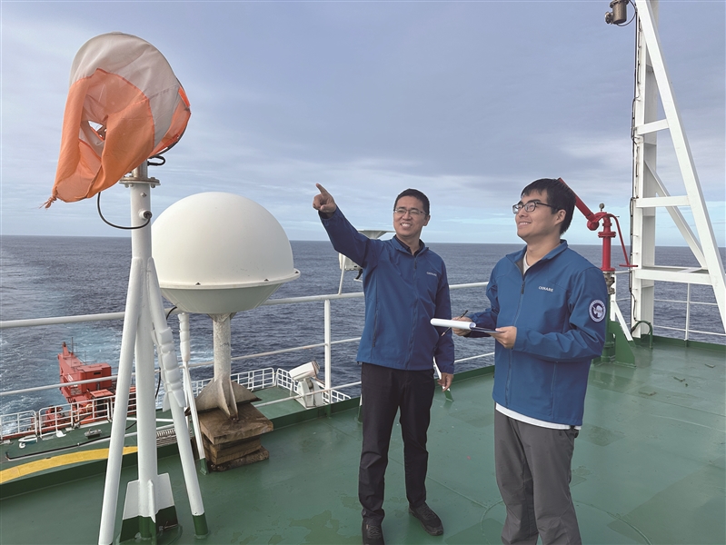 自然资源部南海局高级工程师胡金磊与自然资源部国家海洋环境预报中心助理研究员武晓博是“雪龙2”号气象保障二人组,被戏称为探索自然现象的“海尔兄弟”。这几天,大家看到他们时,第一句话都是“这次西风带的浪大不大”。