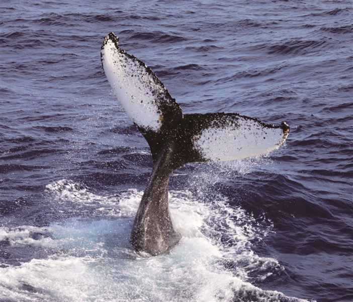 | 座头鲸尾鳍 座头鲸:南极海域最常见且最容易被识别的鲸类。体长13-18米,体重25-35吨,背黑色有斑纹,腹部多为白色或浅色,头顶和下颌都有连串瘤突。背鳍低矮,胸鳍长,具不规则瘤突,尾鳍宽大,外缘呈不规则钳齿状。 |