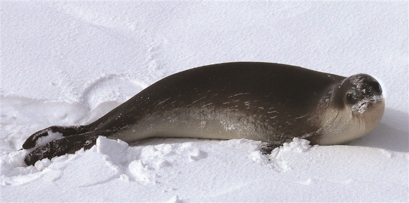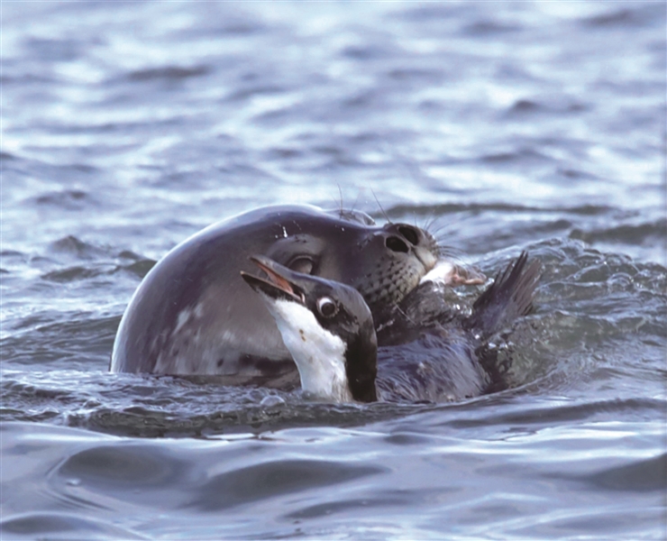 | 威德尔海豹:哺乳动物中繁殖最靠南的种类,可达南纬80度的鲸湾。体长最大3.5米,体重400-600千克,雄性略小于雌性。头小、眼大、口鼻很短,似乎总带有“微笑表情”。体色棕灰或棕黄,体侧具不规则白和深色小斑点。 图为2017年2月5日,在难言岛记录到威德尔海豹捕食阿德利企鹅的罕见行为。 |