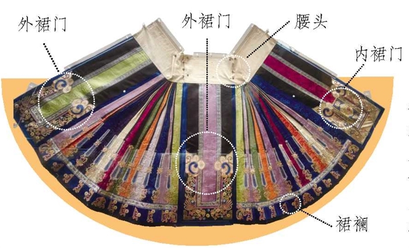 清代是马面裙的鼎盛期,发展出月华裙、阑干裙、凤尾裙、鱼鳞裙等丰富裙形,装饰繁复、色彩斑斓,极致追求华美绚烂。