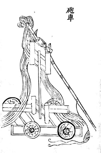 《三国演义》中有不少攻城拔寨的大战,且看其攻防器械。官渡大战中,袁绍拨兵十万,在曹操寨前筑起50余座土山,上立高橹(瞭望与射箭的高台),拨弓弩手于其上,每当曹军欲出时则梆子声响,箭雨倾泻而下,曹军皆蒙盾牌伏地而不得出。面对袁军居高临下的箭雨压制,曹操令造改进型的发石车数百乘,推至土山前,士卒同时发力拽动机关,发巨石腾空而起,将袁绍楼橹尽皆击碎,杀伤弓弩手无数,扭转了战局。因发石车抛石时声如巨雷,被袁军称之为“霹雳车”。