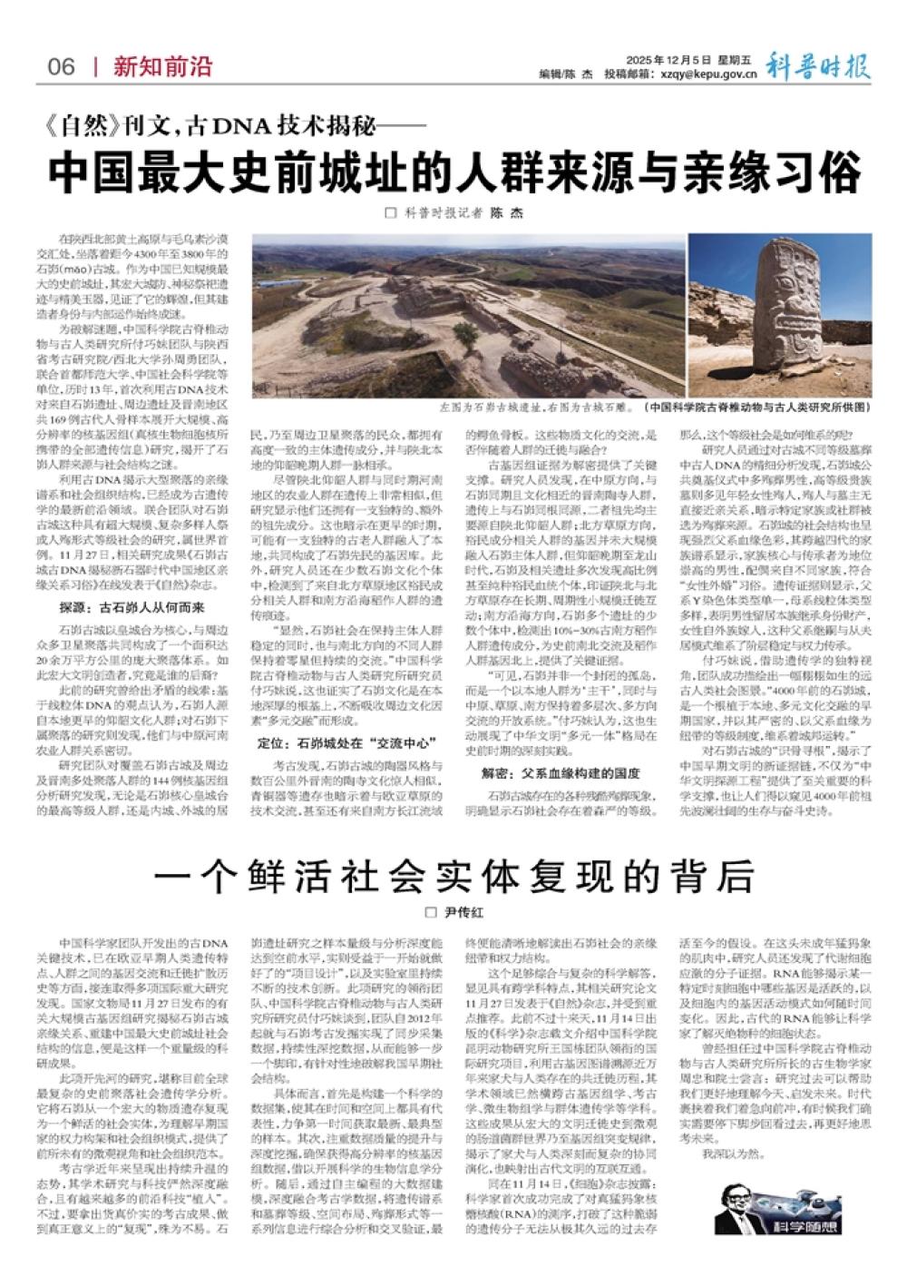 付巧妹说,借助遗传学的独特视角,团队成功描绘出一幅栩栩如生的远古人类社会图景。“4000年前的石峁城,是一个根植于本地、多元文化交融的早期国家,并以其严密的、以父系血缘为纽带的等级制度,维系着城邦运转。”