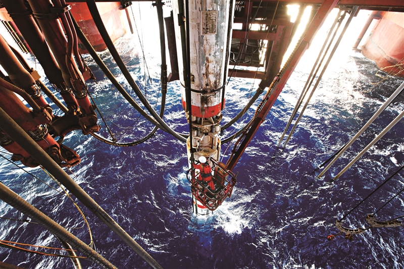 | 2014年10月14日,我国海洋石油981平台钻井工人安装水下防喷器控制电缆卡子。 赵亮 摄 |