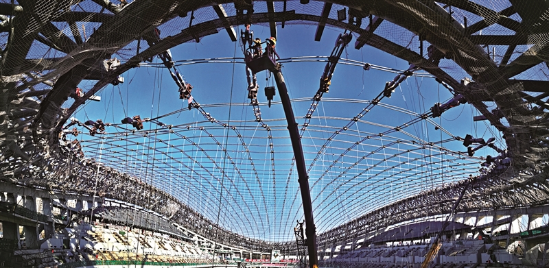 | 2019年1月25日,北京冬奥会国家速滑馆工地,工人正在进行屋面索网结构施工。黎方益 摄 |