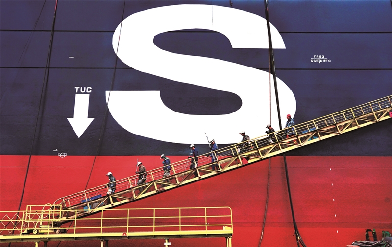 | 2025年4月28日,辽宁省大连市,一艘来自世界航运理事会(WSC)成员的集装箱货轮,在此进行检修。于文国 摄 |