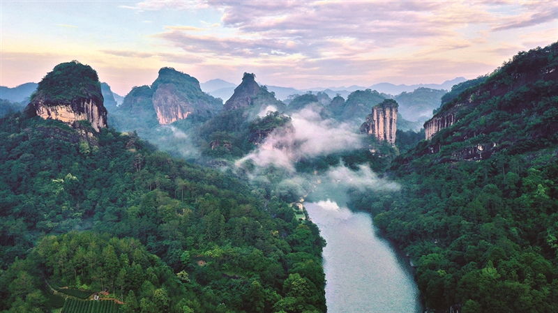 我国丹霞地貌中常见的红色“孤山”,便是红色砂砾岩中硬岩层抵御侵蚀的杰作。世界双遗产武夷山价值独特:中生代火山喷发与花岗岩侵入奠定基础,流水长期侵蚀造出36峰、99岩的奇特地貌;岩层差异使西部高峰由坚硬凝灰熔岩构成,东部发育开阔谷地。2021-2024年调查显示,这里已发现34个新物种、10个中国新记录种,成为名副其实的“物种基因库”。