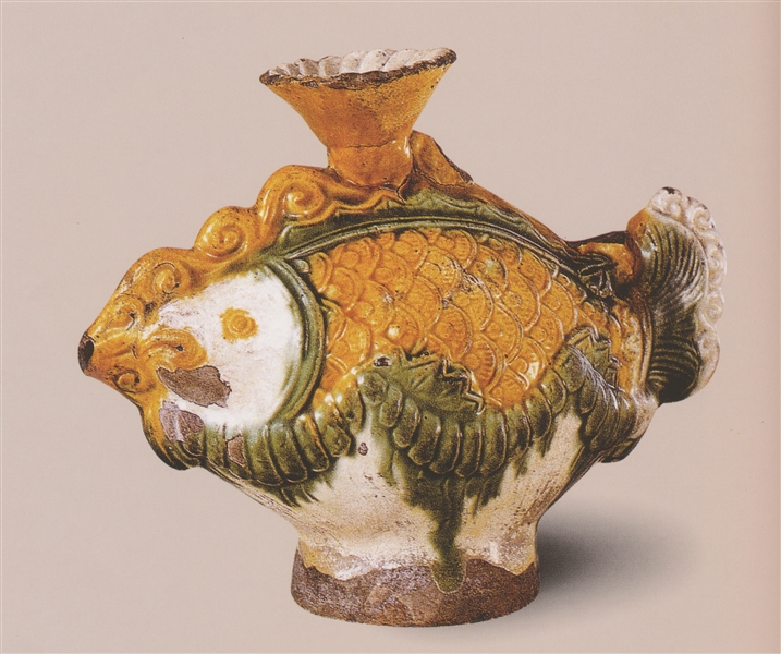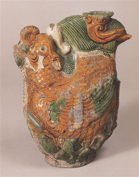 宋代沈括《梦溪笔谈》记:“契丹人牧猎,携皮囊盛乳浆,后陶工效其形”,直接道出鸡冠壶独特形制的由来。又如海棠花式长盘、方碟马镫壶和凤首瓶等,器形简洁实用,契合草原宴饮习俗。诸多具有少数民族特色的器形独具一格、特色鲜明,如辽三彩摩羯壶、辽三彩鱼形壶(见图)等器物,开创了新的艺术造型形式。而人物俑、动物俑虽然沿袭唐制,但人物面容丰硕、体态敦实,颇具契丹族特征,与唐代瓷器秀逸灵动的风格截然不同。