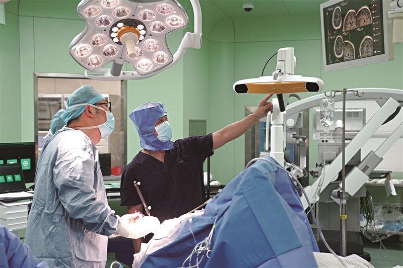 | 2025年3月25日,复旦大学附属华山医院,医生为我国第一例侵入式脑机接口临床试验受试者做手术。 新华社发 陈杰 摄 |