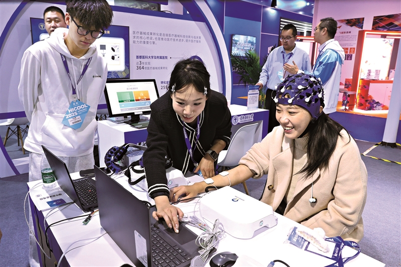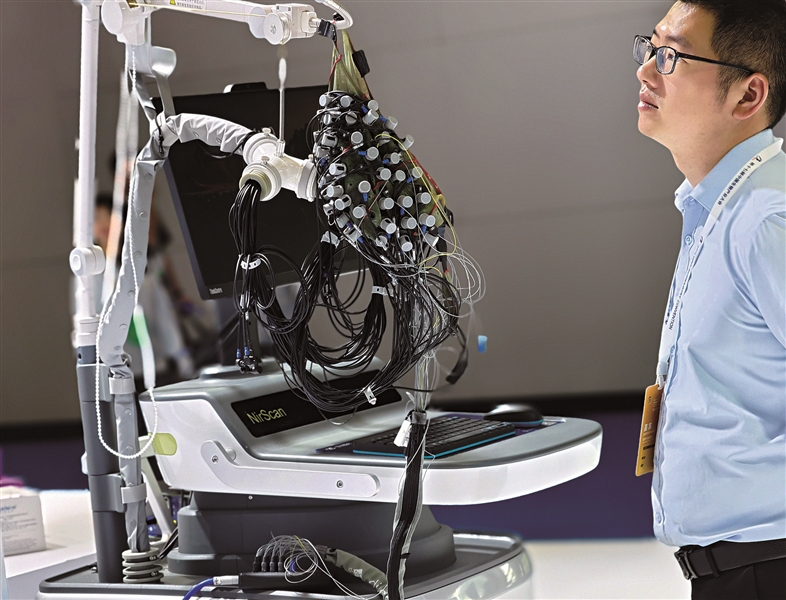 | 2025年9月4日,湖北武汉,第十七届中国生物产业大会上,同济医院展示的光学脑机接口。 视觉中国供图 |