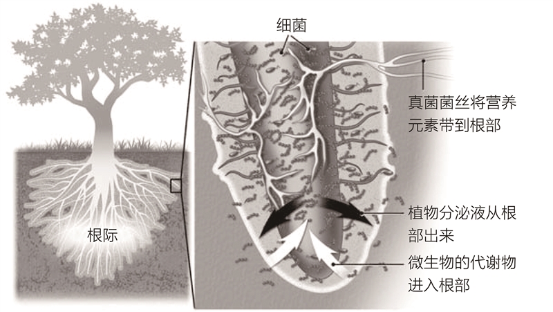 | “地下经济”一隅。植物根部周围的根际,是植物与土壤微生物之间进行无数次交易的场所。真菌和细菌都会消耗植物的分泌物,反过来,它们会为植物提供对于生长和健康至关重要的营养和代谢物。(选自《看不见的大自然:生命和健康的微生物根源》一书。北京大学出版社授权使用。) |