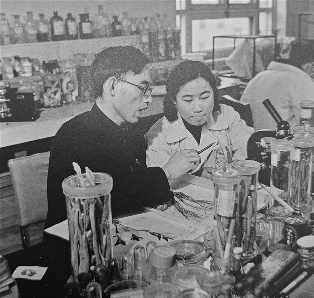 | 1957年,楼之岑(左)指导屠呦呦(右)研究中药银柴胡的品种问题。中国科学家博物馆供图 |