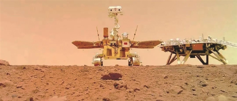 | “祝融号”火星车拍摄的“着巡合影”图。图片来源:中国国家航天局 |