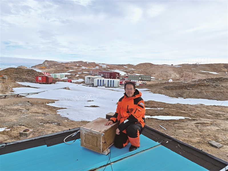 | 袁亚平在中山站,与他曾在中国第13、17次南极考察中使用过的观测仪器合影。 |