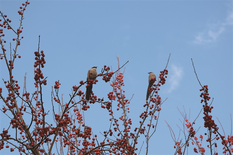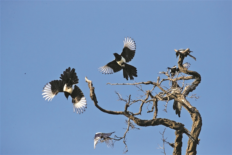 喜鹊适应能力超强,是杂食性鸟类。夏天以昆虫为食,能帮农田除害虫;昆虫减少时就吃植物类食物。作为留鸟,喜鹊不随季节迁徙,常年待在人们身边,白天去开阔处觅食,傍晚回高树上休息,给人安稳亲切的感觉。