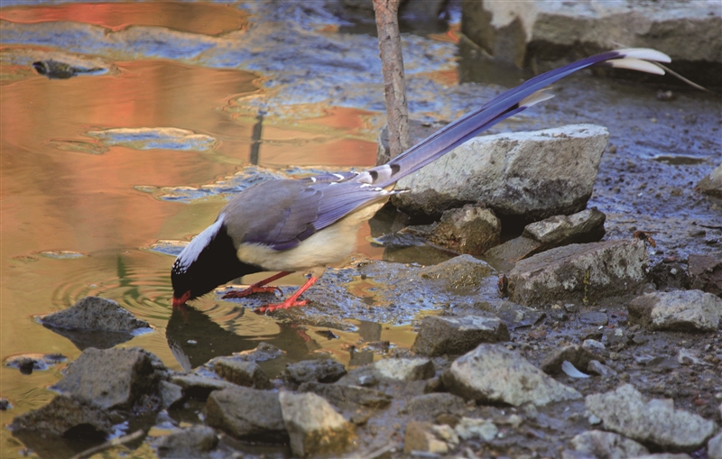 红嘴蓝鹊是喜鹊家族中的“颜值担当”,体型修长,身姿优雅。它最显著的特征是亮蓝色羽毛,宛如天空截取的一抹蔚蓝,头部至前胸及肩部为丝绒般的黑色,与蓝色羽毛形成鲜明对比,背部略带淡紫色,更显高贵。其尾羽极长,末端白色,向下垂坠,层次丰富,喙和腿为红粉色至珊瑚红色。