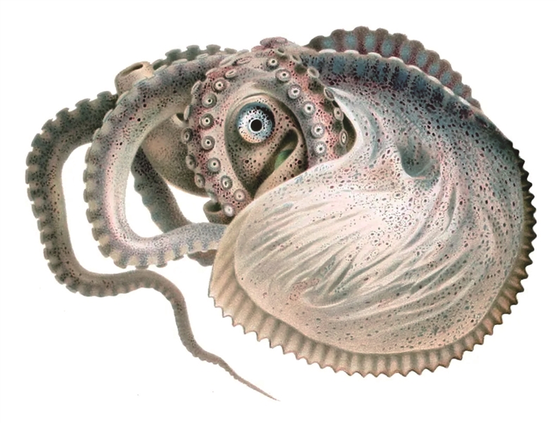 书中这种外形独特、行为奇异的生物并非虚构,而是章鱼家族的“船蛸(xiāo)”。我们来重点介绍其中的扁船蛸,尤其是雌性扁船蛸,能分泌薄如蝉翼的螺旋形外壳,宛如小船在海中漂浮,外壳又像只有纸张一样薄厚的鹦鹉螺,因此被称为“纸鹦鹉螺”。