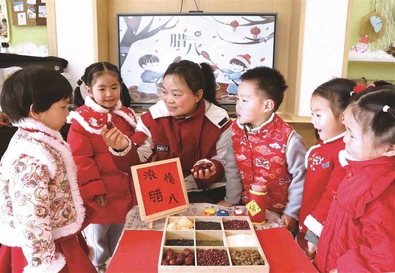 | 腊八节将至,老师在教小朋友认识制作腊八粥的食材。 新华社发 |