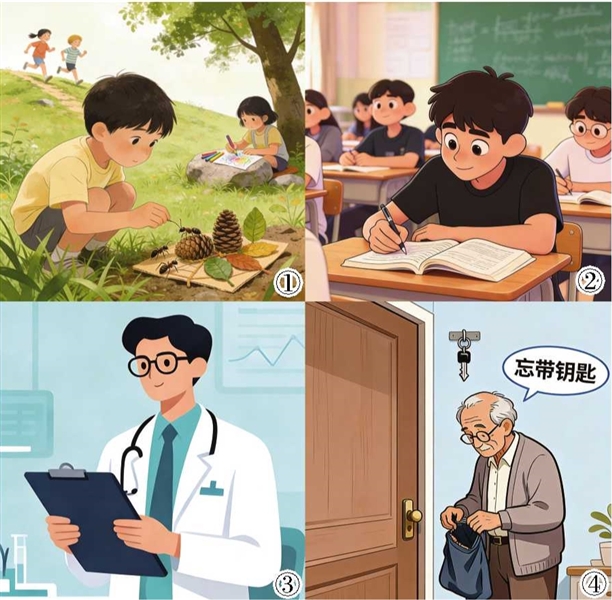 | 图①: 9岁前多让孩子在自然中探索,让大脑各功能区在适度刺激中稳步成型。 图②: 9-32岁是大脑的“高速优化期”,我们能一边听课一边记笔记。 图③: 32-66岁是大脑的经验黄金期,有经验的医生能精准诊断病情,靠的都是这个阶段的优势。 图④: 66岁以后,大脑各功能区的协同能力有所下降,同时处理好几件事就容易出错。 AI制图 |