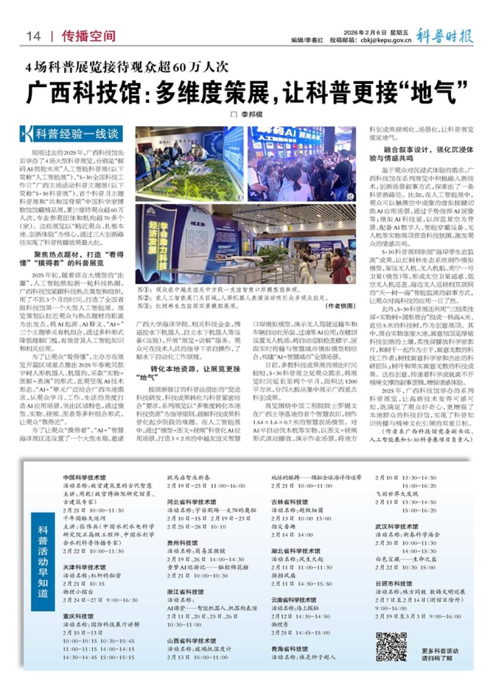 刚刚过去的2025年,广西科技馆先后举办了4场大型科普展览,分别是“解码AI拥抱未来”人工智能科普展(以下简称“人工智能展”)、“5·30全国科技工作日”广西主场活动科普主题展(以下简称“5·30科普展”)、首个科普月主题科普展和“共和国脊梁”中国科学家博物馆馆藏精品展,累计接待观众超60万人次,专业参观团体和机构超70多个(家)。这些展览以“贴近观众、扎根本地、创新体验”为核心,通过三大创新路径实现了科普传播效果最大化。